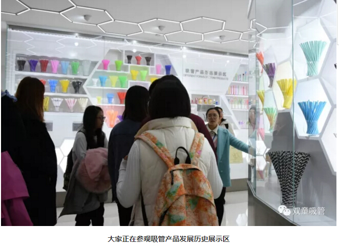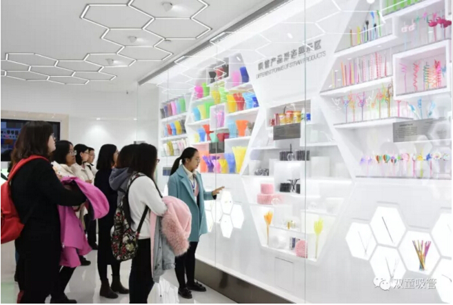 在參觀了吸管墻后,大家也了解了特殊的長吸管,長吸管和普通吸管的不同之處是它帶有“雙童”的專利——止回閥,有了止回閥,吸上去的水不會再回流到桶里,從而讓人們在用長吸管飲用過程中有一個更好的體驗!緊接著,大家參觀了吸管產(chǎn)品形態(tài)展示區(qū),單支包裝吸管、常規(guī)類吸管產(chǎn)品、用于飲料配套的工業(yè)配套吸管、紙吸管、水晶玻璃吸管……形態(tài)各異的也讓參觀團隊們看花了眼,直呼真是長見識了!
