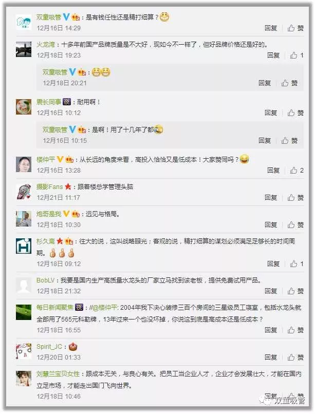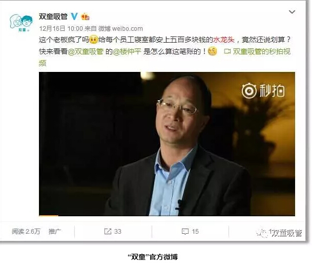 許多民營(yíng)企業(yè)都認(rèn)為不必給員工用太好的硬件,希望用最低的成本創(chuàng)造最大的價(jià)值。因此,前段時(shí)間,“雙童”官方微博發(fā)布了一條關(guān)于12年前老板給每個(gè)員工寢室配置了五百多元高級(jí)水龍頭的微博就引發(fā)了網(wǎng)友的熱議,不少粉絲都很詫異一個(gè)水龍頭五百多元老板居然說(shuō)不貴!這樣的高硬件配置究竟是低成本還是高成本?今天吸管妞就和大家來(lái)好好算算這筆賬劃不劃算!