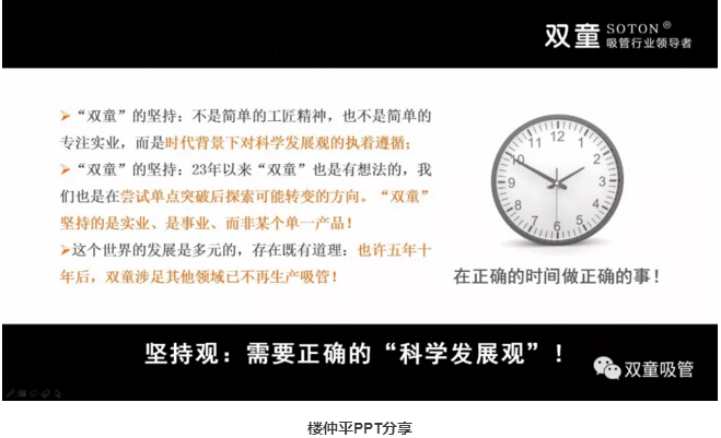 樓仲平也分享了“雙童”在發(fā)展歷程中經(jīng)歷的小客戶(hù)原則、“兩條腿走路”戰(zhàn)略及“雙童”的“創(chuàng)新之樹(shù)”,學(xué)習(xí)、創(chuàng)新、轉(zhuǎn)變逐漸成為“雙童”經(jīng)營(yíng)活動(dòng)的核心所在,并形成獨(dú)具“雙童特色”的組織思維和文化!