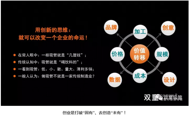 在傳統(tǒng)的認(rèn)知當(dāng)中,類(lèi)似于塑料吸管這樣的產(chǎn)品門(mén)檻低,不起眼,是典型的“低、小、散、弱”傳統(tǒng)邊緣產(chǎn)品,很難做品牌。但“雙童”用創(chuàng)新的思維不斷努力,硬是把一個(gè)看似不可能的產(chǎn)品創(chuàng)造出大品牌,打破了吸管這類(lèi)產(chǎn)品不能做品牌的傳統(tǒng)偏見(jiàn)!